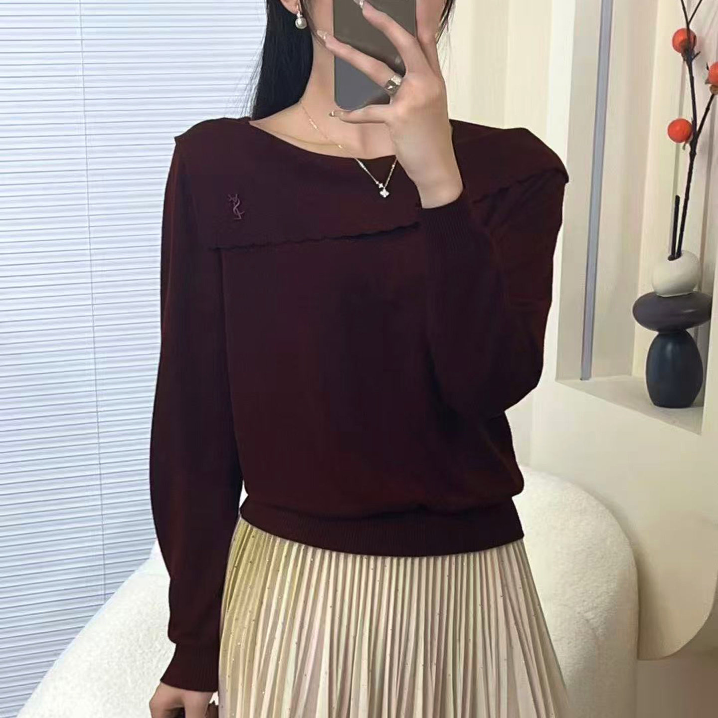 颂宋 秋冬新款韩版设计感荷叶边收腰一字肩喇叭袖针织上衣DT1652