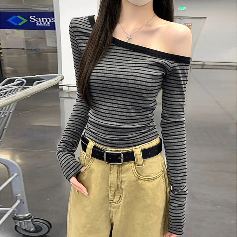 chic甜辣条纹一字斜肩长袖T恤女春秋修身韩版短款内搭打底衫上衣