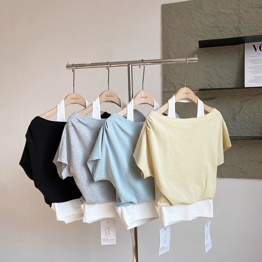 一字领露肩上衣韩版宽松显瘦学生港味抖音夏chic斜领欧货大板T恤