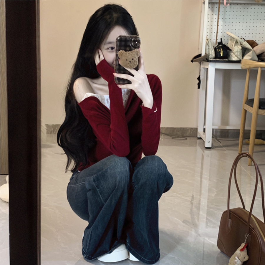 蕾丝拼接一字斜肩长袖T恤女春秋修身韩版打底衫纯欲风假两件上衣