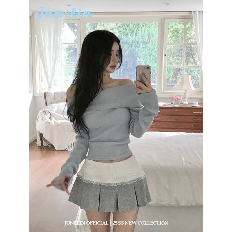 六月林 韩版温柔一字肩针织长袖上衣拼蕾丝百褶短裙套装显瘦高级