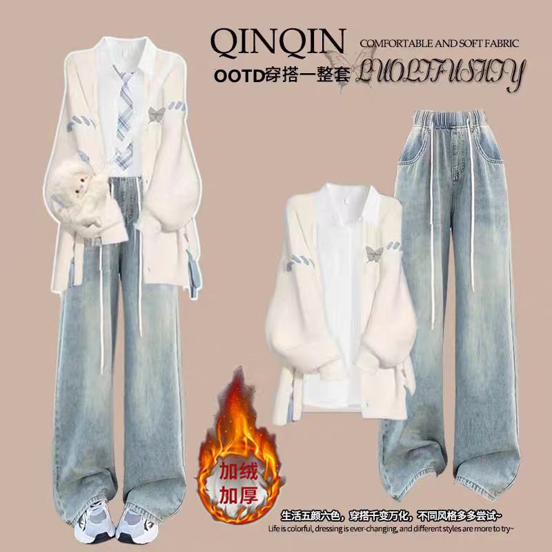 初中生时尚套装女2025新款少女中学生毛衣开衫外套牛仔裤三件套装
