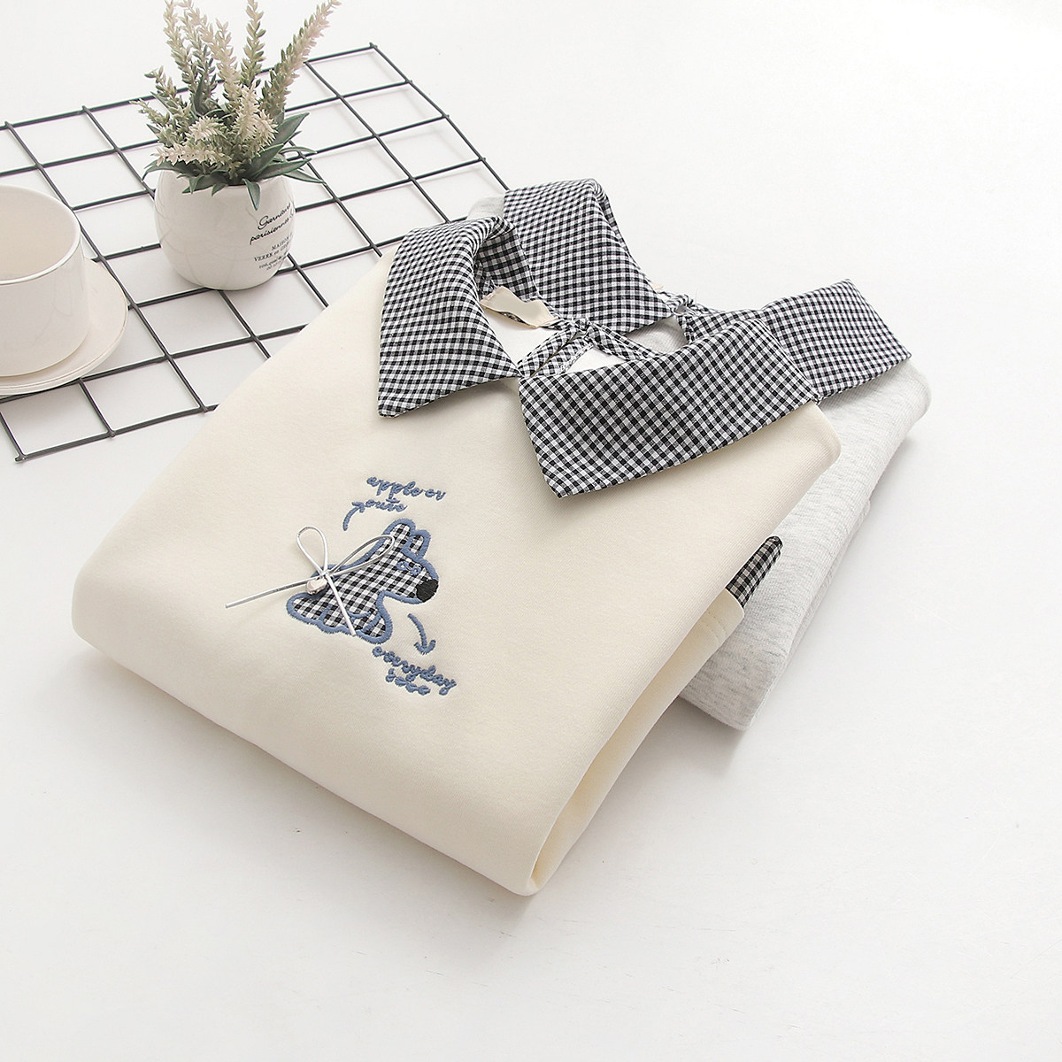韩版文艺清新学院风格子领刺绣翻领小狗长袖卫衣女秋季小个子上衣