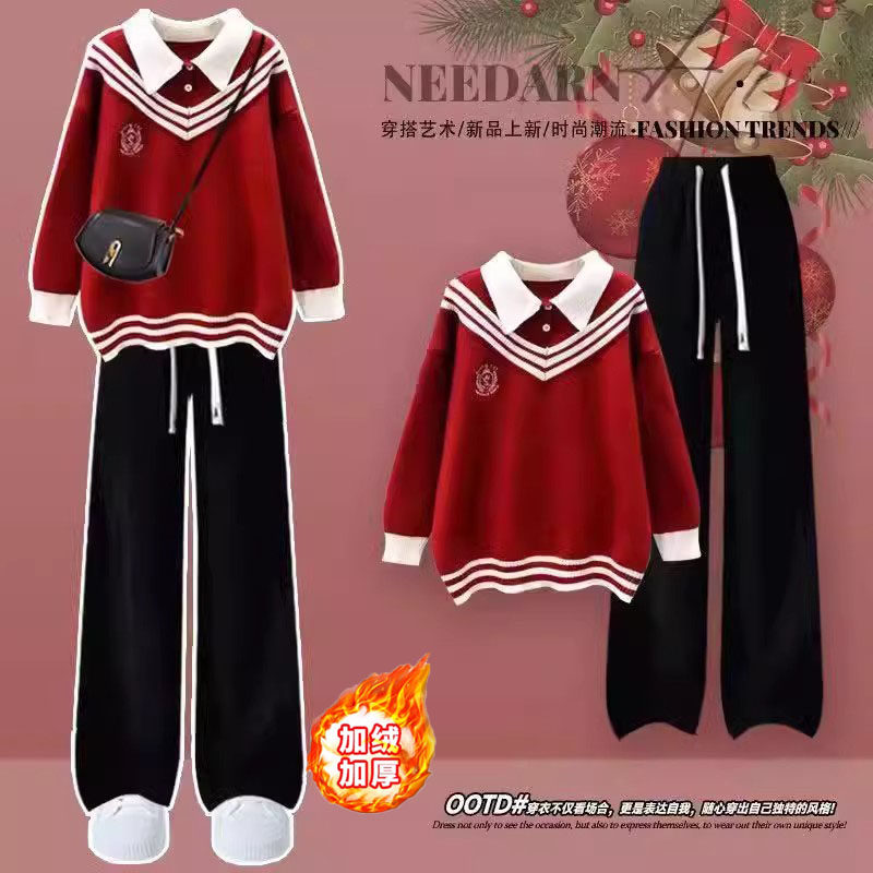 冬季套装女学生韩版学院风红色假两件长袖毛衣+加绒直筒裤两件套