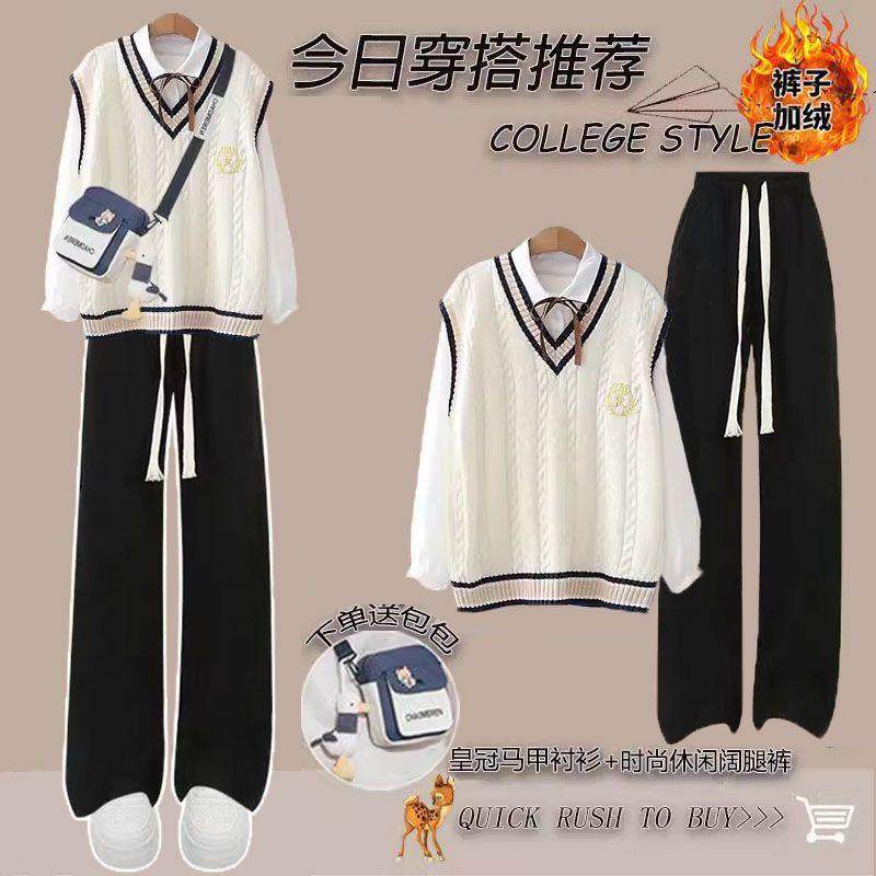 送包秋冬套装女学生韩版宽松学院风马甲长袖衬衫加绒阔腿裤三件套