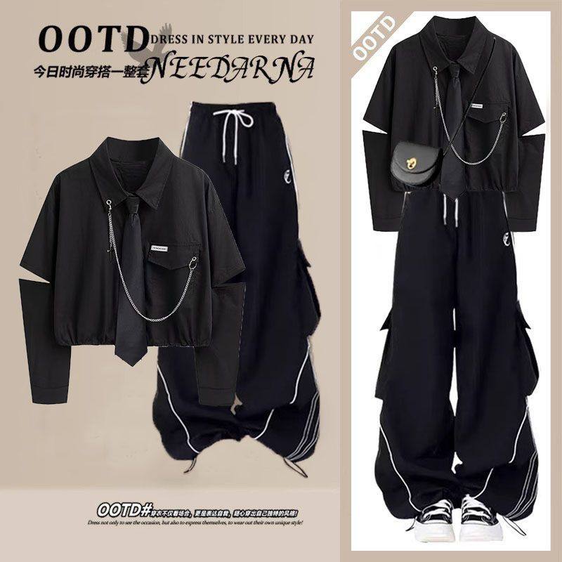 春夏甜酷套装女学生韩版宽松学院风长袖衬衫+帅气工装裤两件套潮