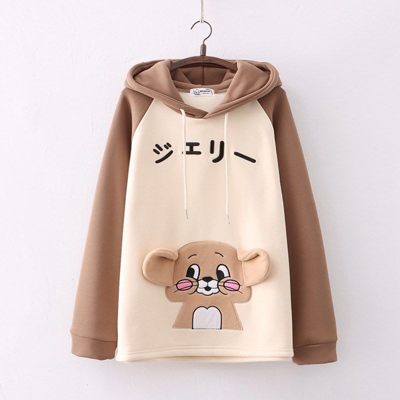 韩版少女学院风可爱卡通小老鼠贴布长袖连帽加绒学生减龄卫衣女冬