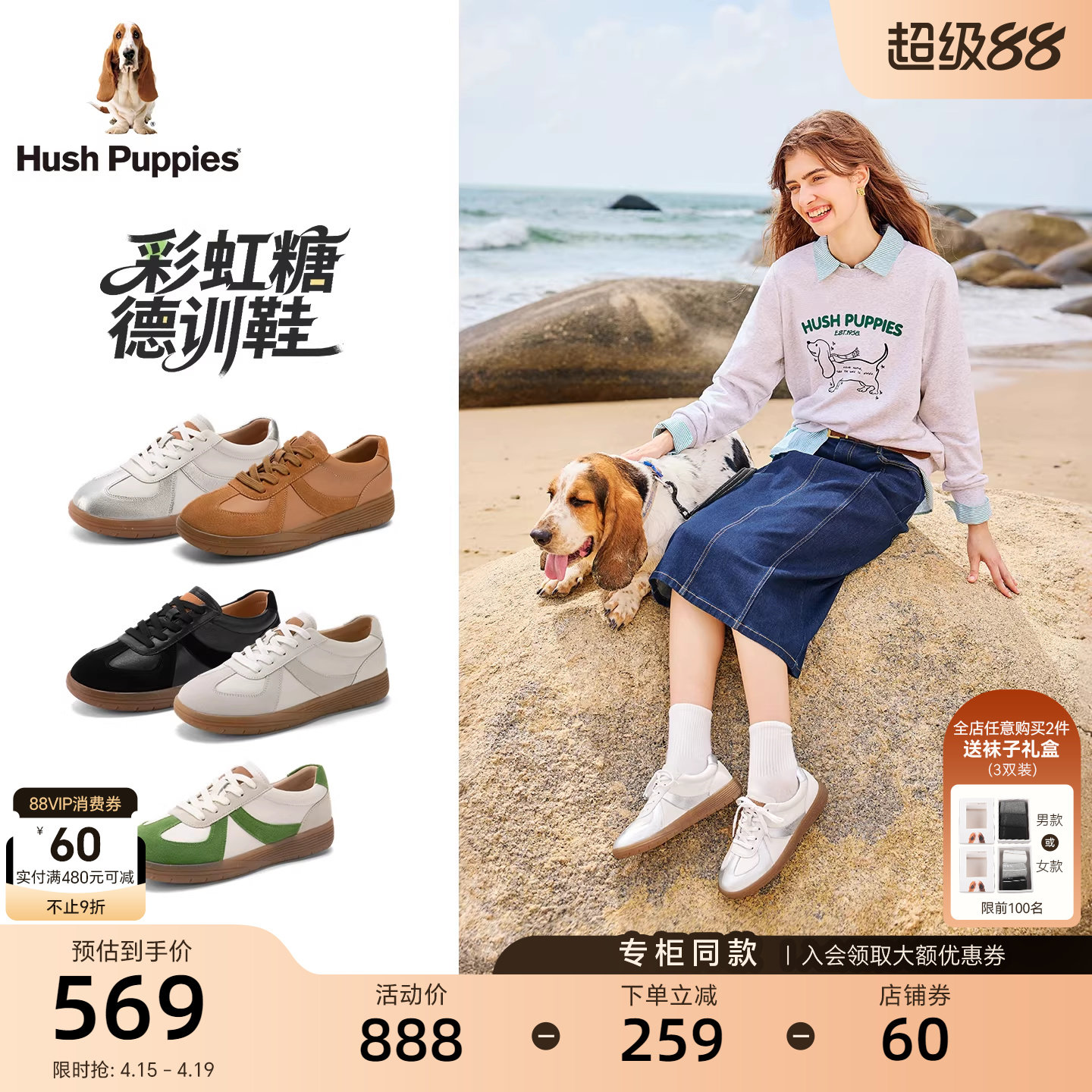 暇步士彩虹糖经典德训鞋春夏款女鞋平底阿甘鞋真皮休闲鞋复古板鞋