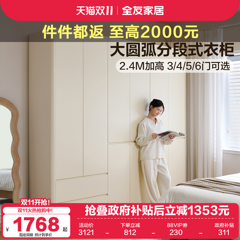 全友家居分段式圆弧大衣柜2025新款爆款简约家用卧室成品衣橱家具