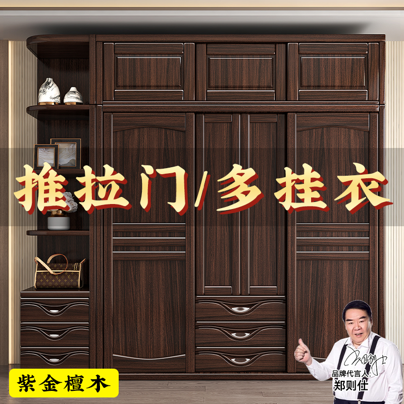 新中式紫金檀木实木衣柜家用卧室推拉门大衣橱小户型大容量储物柜