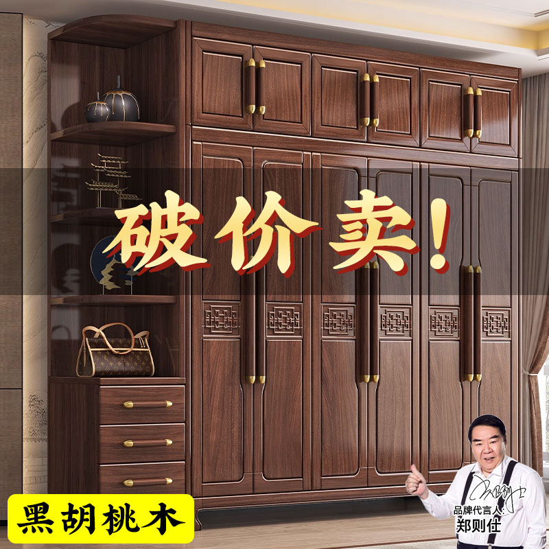 新中式黑胡桃木实木衣柜家用卧室轻奢三四五六门大衣橱全实木家具