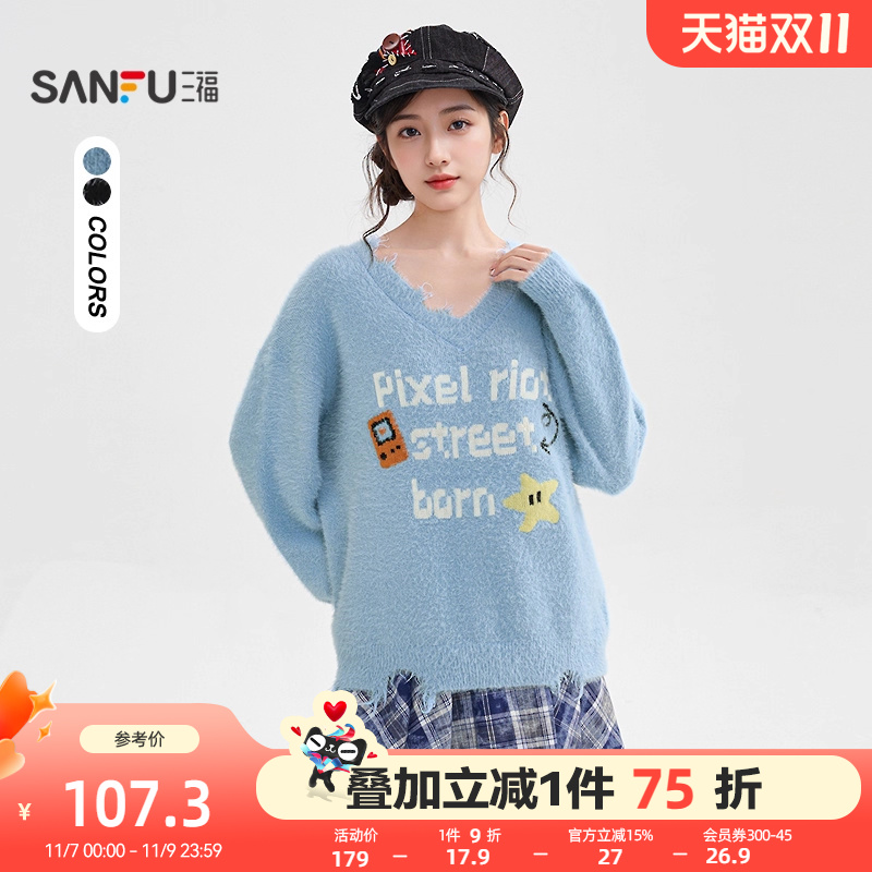 三福套头毛衣冬季新款2025星星英文图案破洞摆V领上衣女装510494