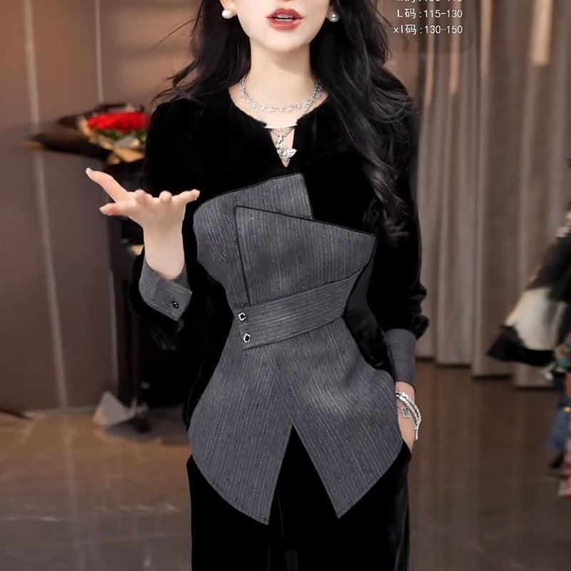 高级感撞色掐腰显瘦丝绒上衣2025秋季新款气质小V领套头女装衬衫