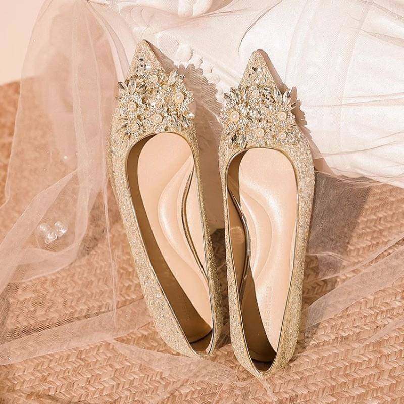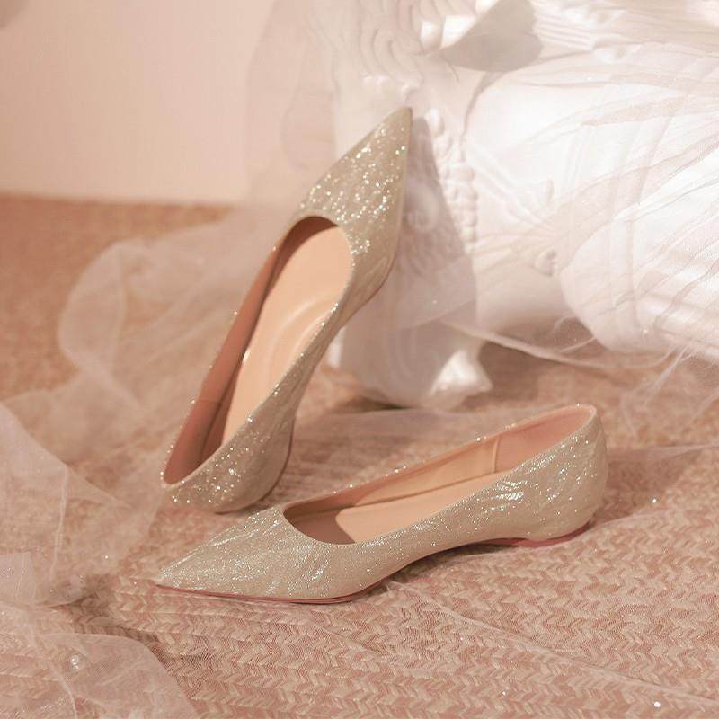 香港亮片平底单鞋女2025年春秋新款孕妇婚鞋婚纱低跟新娘鞋水晶鞋