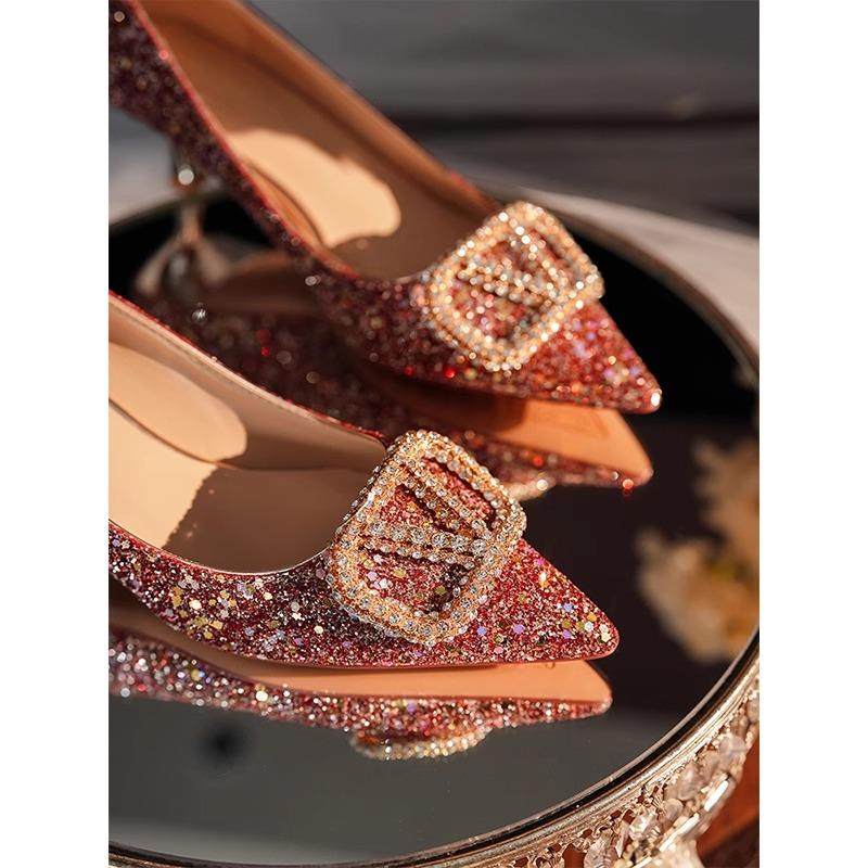 AGLFLIN礼服婚鞋女2025秋季新款水晶亮片高跟鞋新娘伴娘鞋细跟鞋