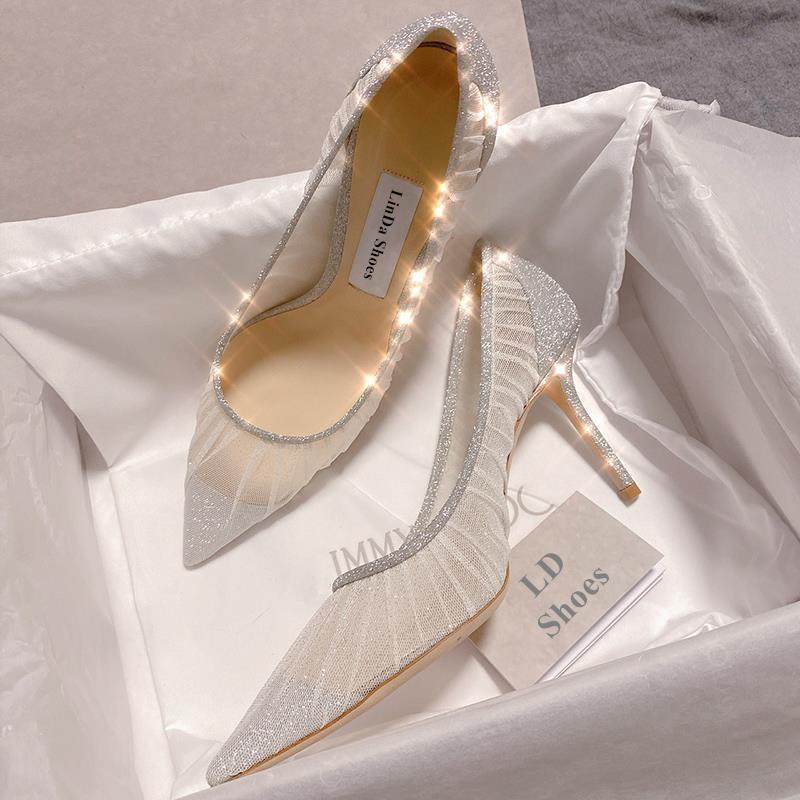 香港网眼高跟鞋女士2025春季和秋季新仙女风格尖头细高跟新娘鞋婚