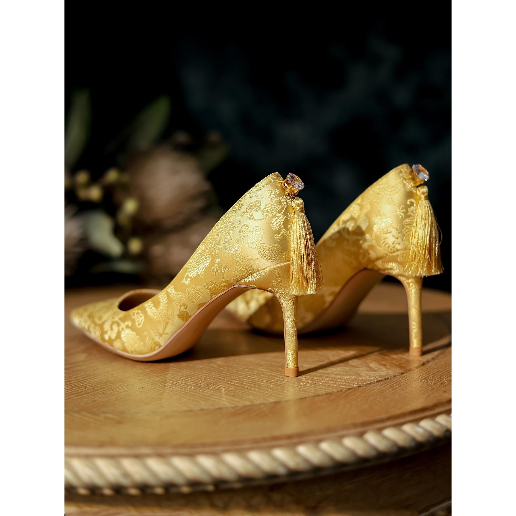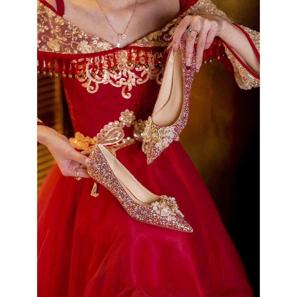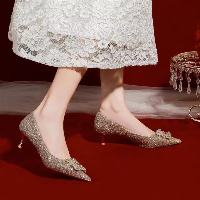 香港婚礼鞋2025新新娘鞋金色高跟鞋不累脚女孩细高跟伴娘水晶鞋