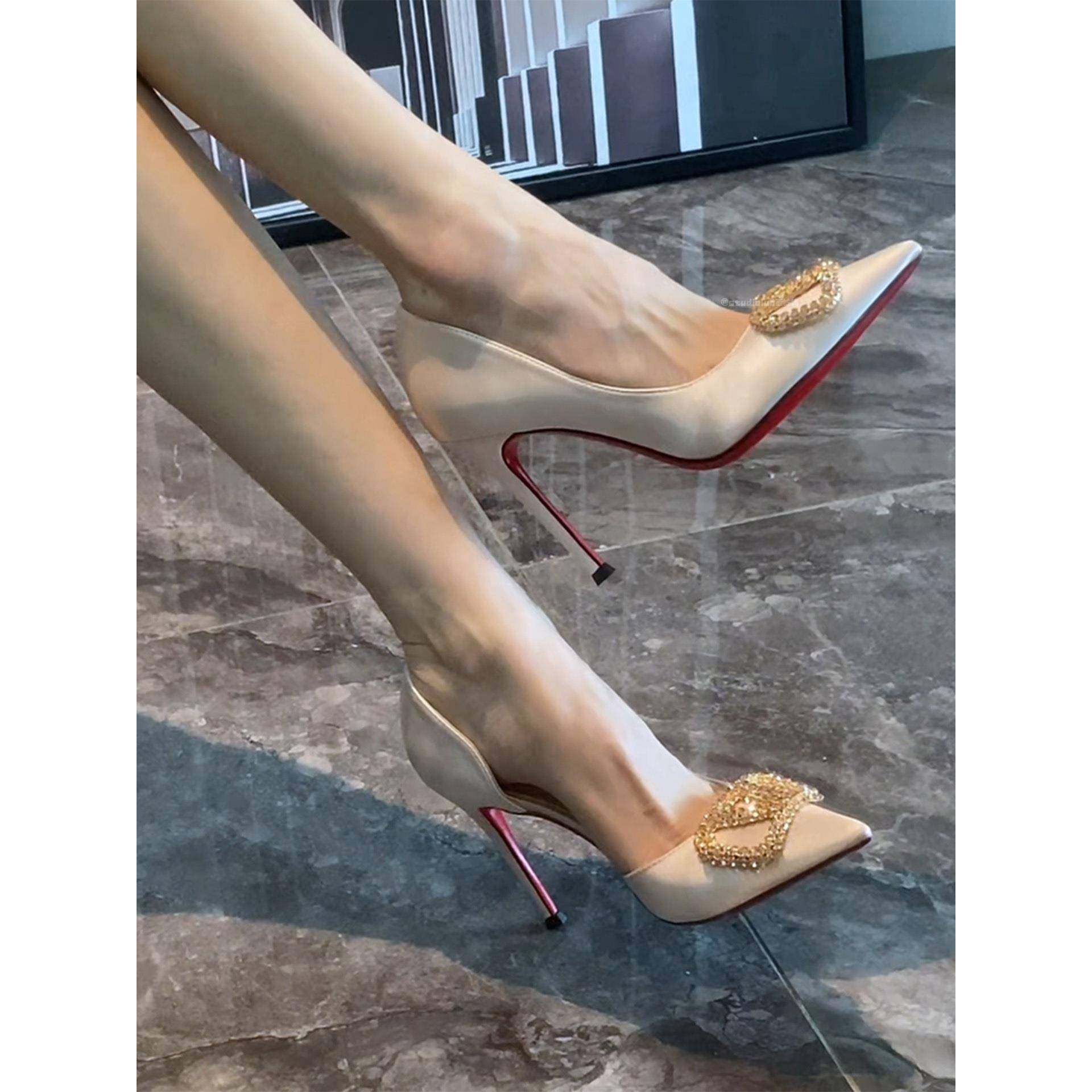香港侧空红底高跟鞋女2025春秋新款尖头细跟水钻单鞋不累脚新娘鞋