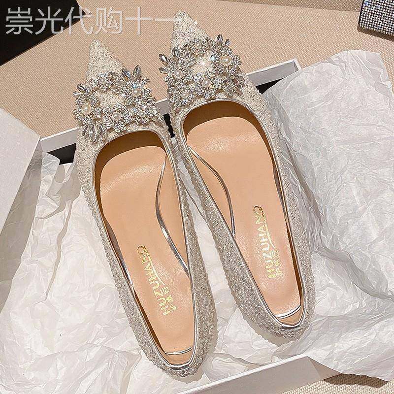 香港网红尖头平底单鞋女新娘春秋季新款百搭银色婚纱伴娘结婚鞋潮