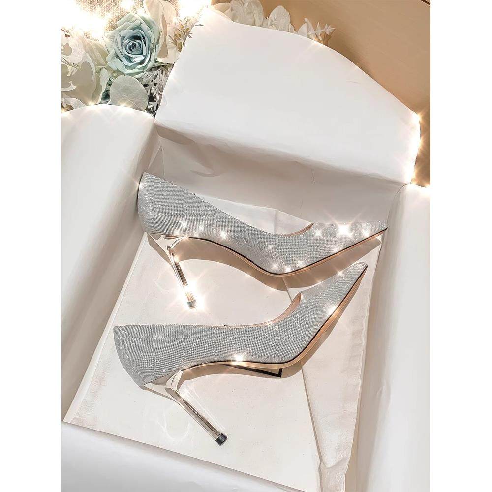 香港银色高跟鞋女士细跟尖头2025水晶婚礼鞋新娘鞋婚纱婚纱订婚鞋