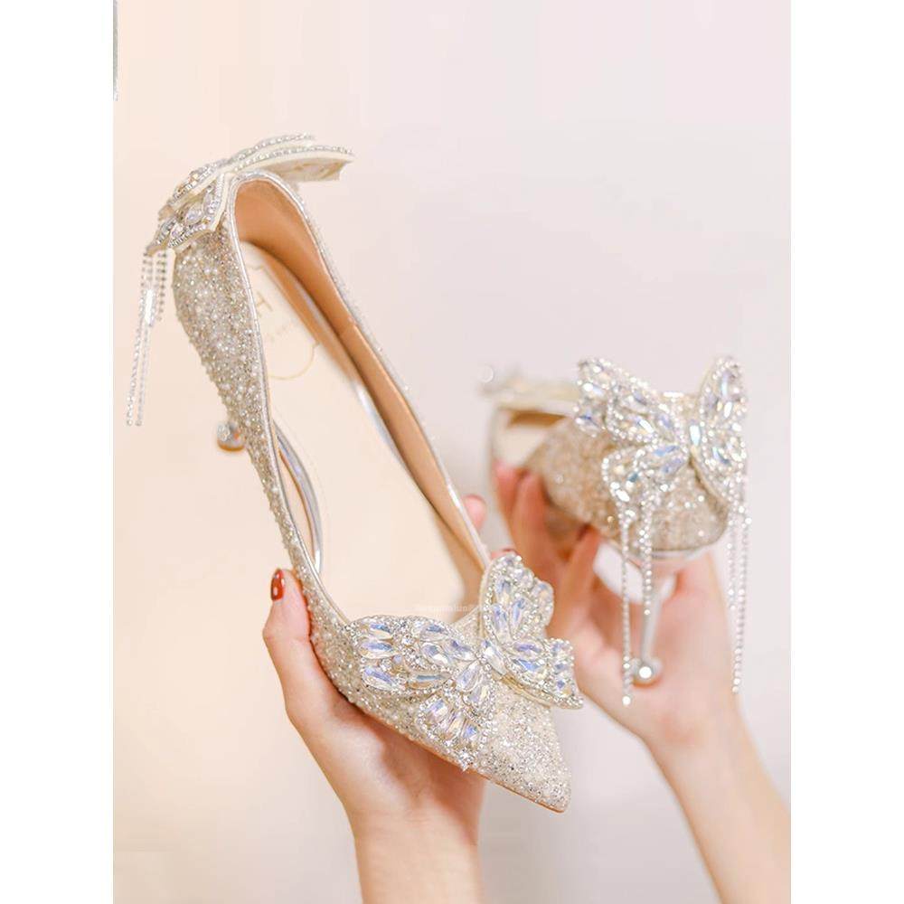 2025新款银色婚鞋女宴会尖头水钻高跟鞋公主细跟水晶鞋新娘婚纱鞋