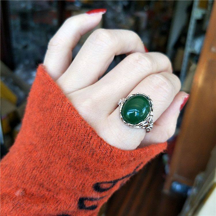 925纯银绿玛瑙玉髓夸张大个性食指戒指女轻奢高级感小众设计复古