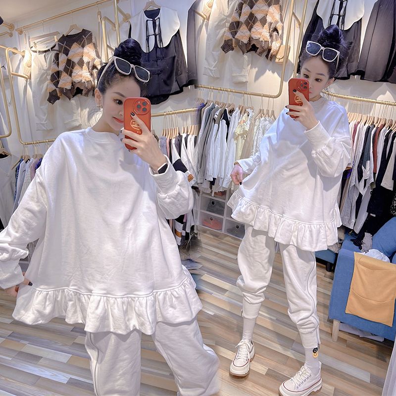 特大码2-300斤春秋韩版时尚宽松套装女荷叶边长袖上衣+长裤两件套