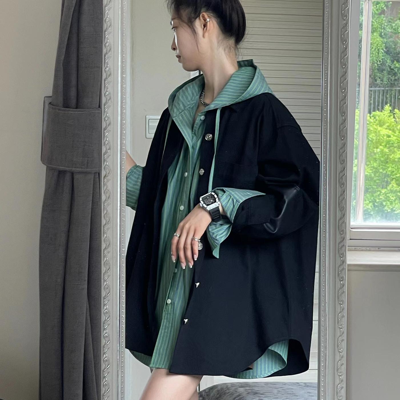 春秋新款港风穿搭两件套装休闲宽松黑色外套+绿色韩版连帽衬衫女