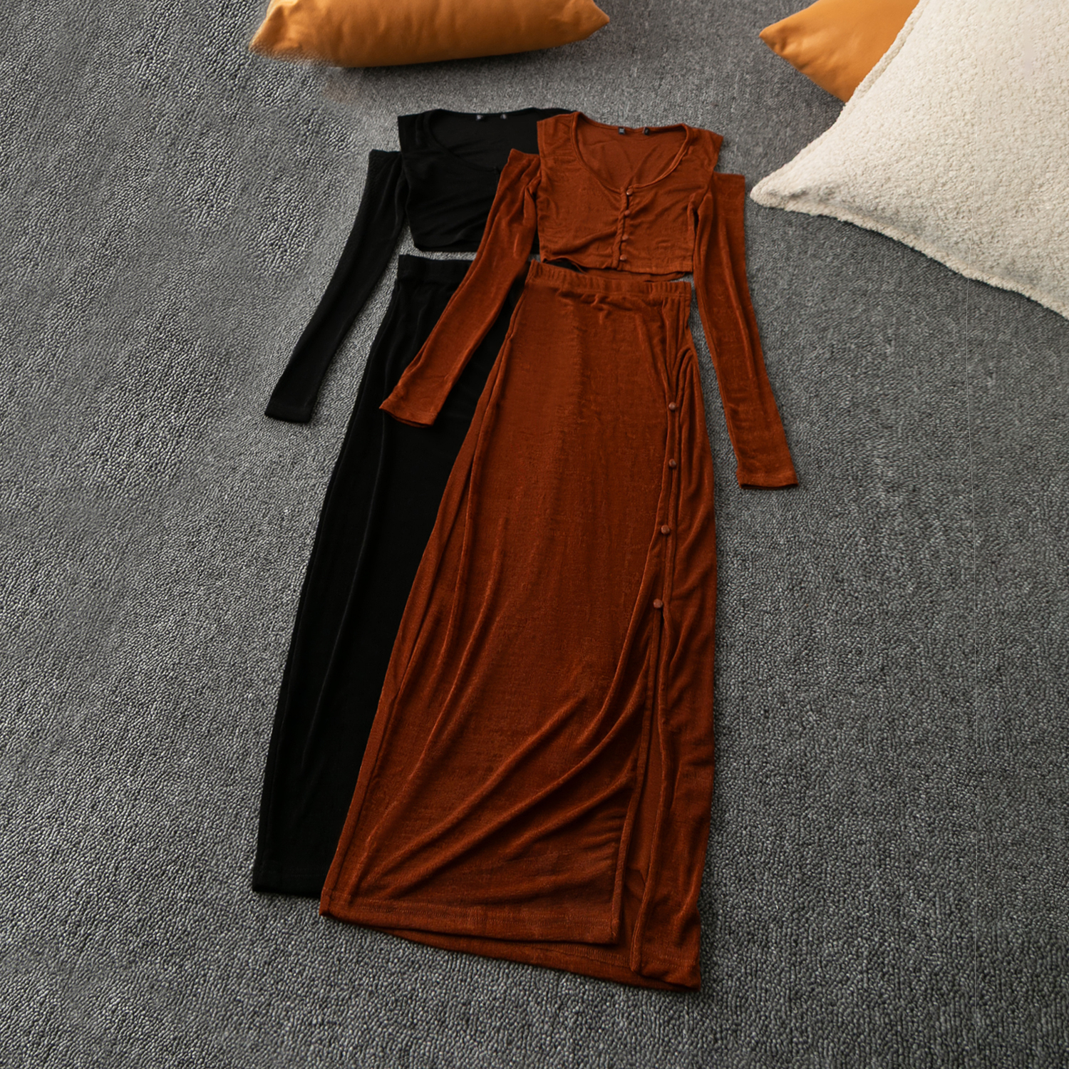 春秋外贸韩版两件套 短款圆领长袖镂肩上衣+松紧腰长款半身裙套装