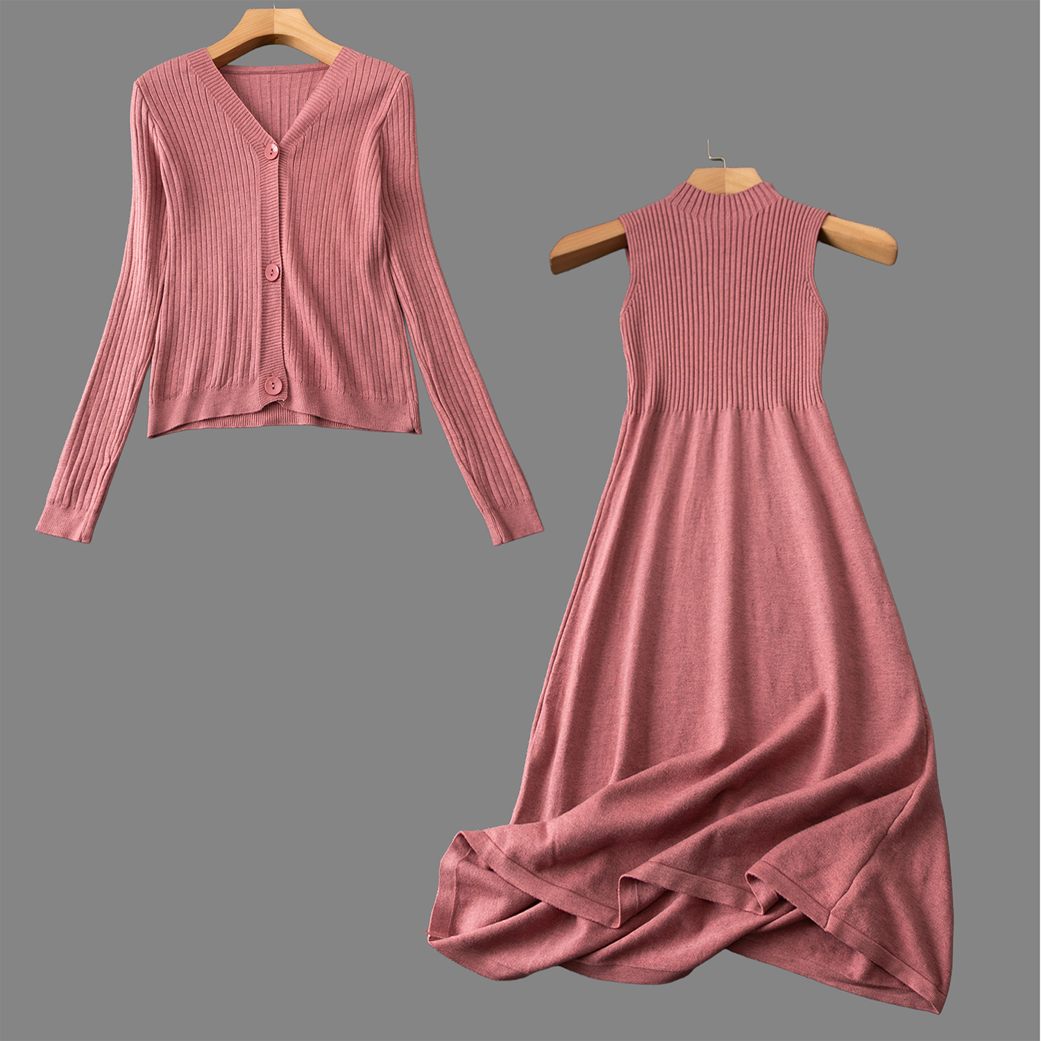 春秋外贸韩版新款两件套 V领长袖针织开衫+圆领无袖连衣裙套装