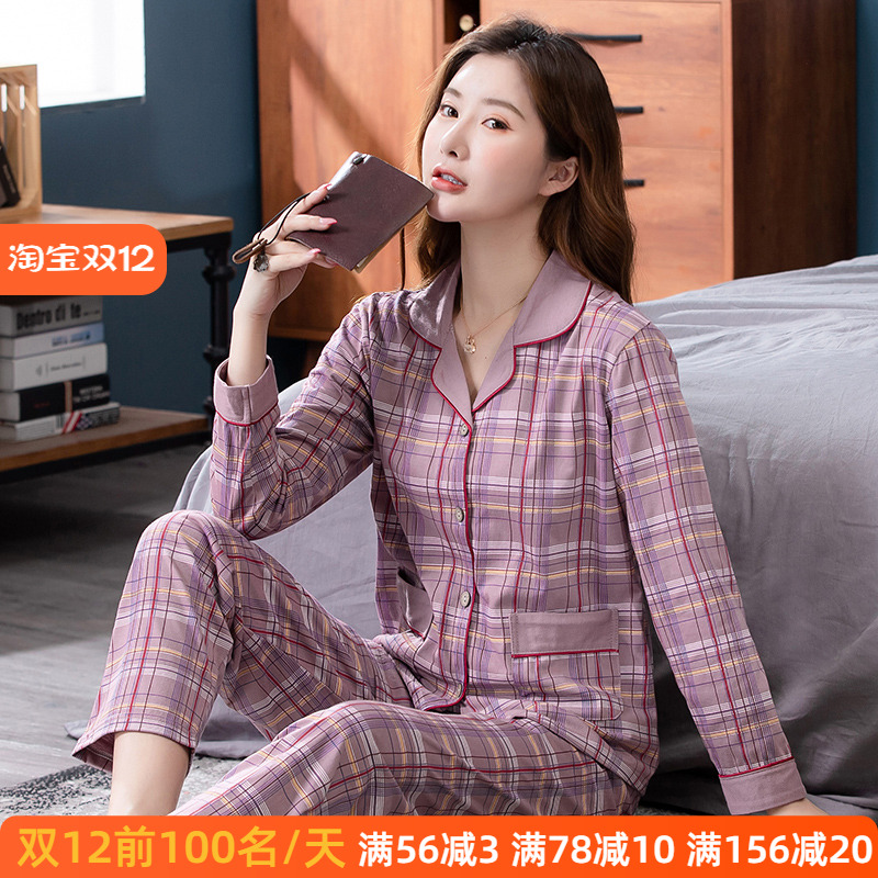春秋季睡衣女纯棉长袖韩版女装格子全棉妈妈大码可外穿家居服套装