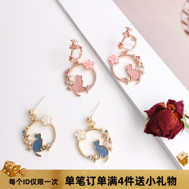 韩国韩版甜美可爱蓝色猫咪耳环简约清新粉色樱花无耳洞耳夹耳饰女