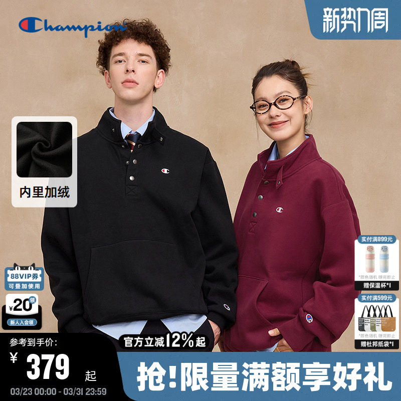 Champion冠军情侣加绒卫衣男2025冬季新款立领潮牌红色半扣上衣女
