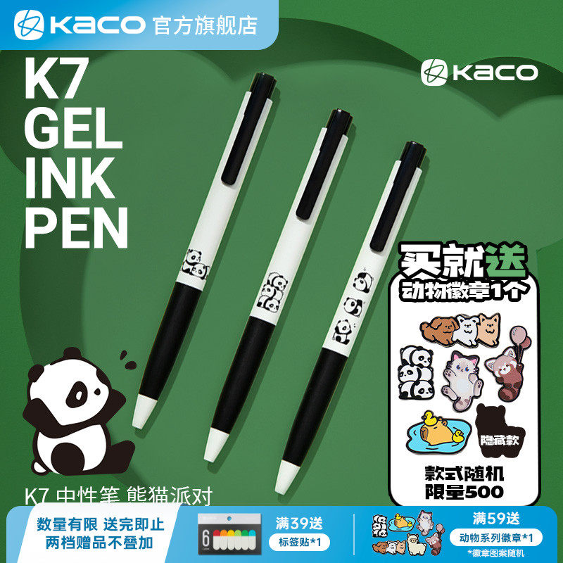KACO K7熊猫派对速干黑色中性笔按动式3支装 高颜值0.5mm笔芯 学生书写学习用刷题水笔文具少女心可爱超萌