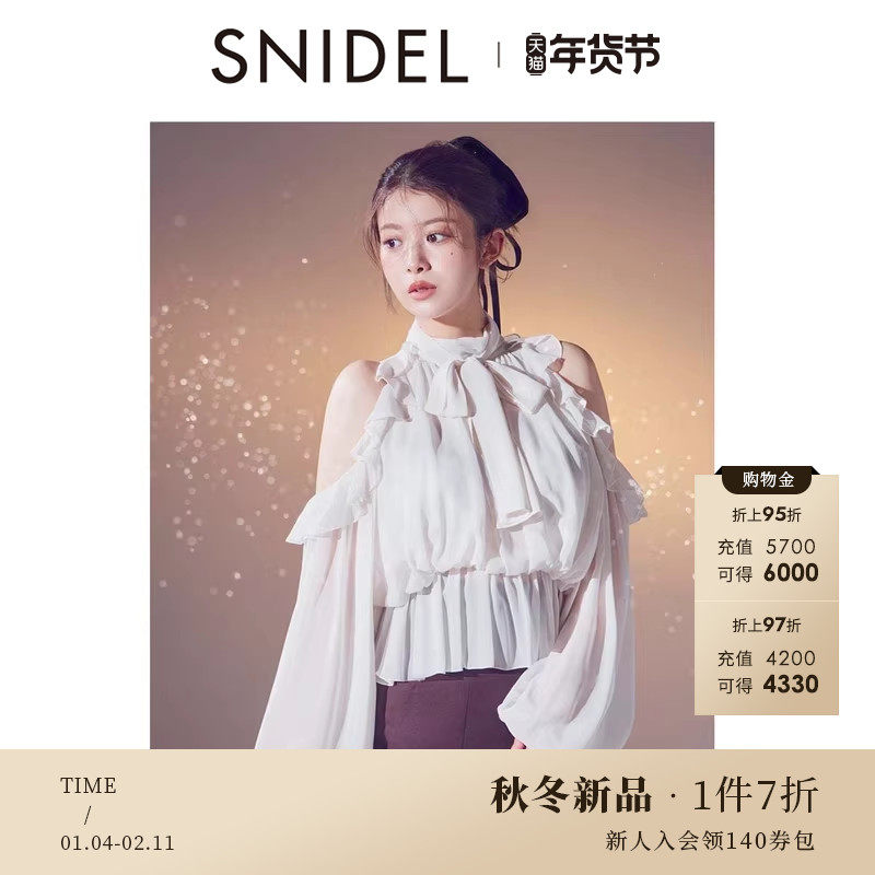 SNIDEL2025秋冬新品甜美荷叶边露肩压褶蝴蝶结系带衬衫SWFB255028