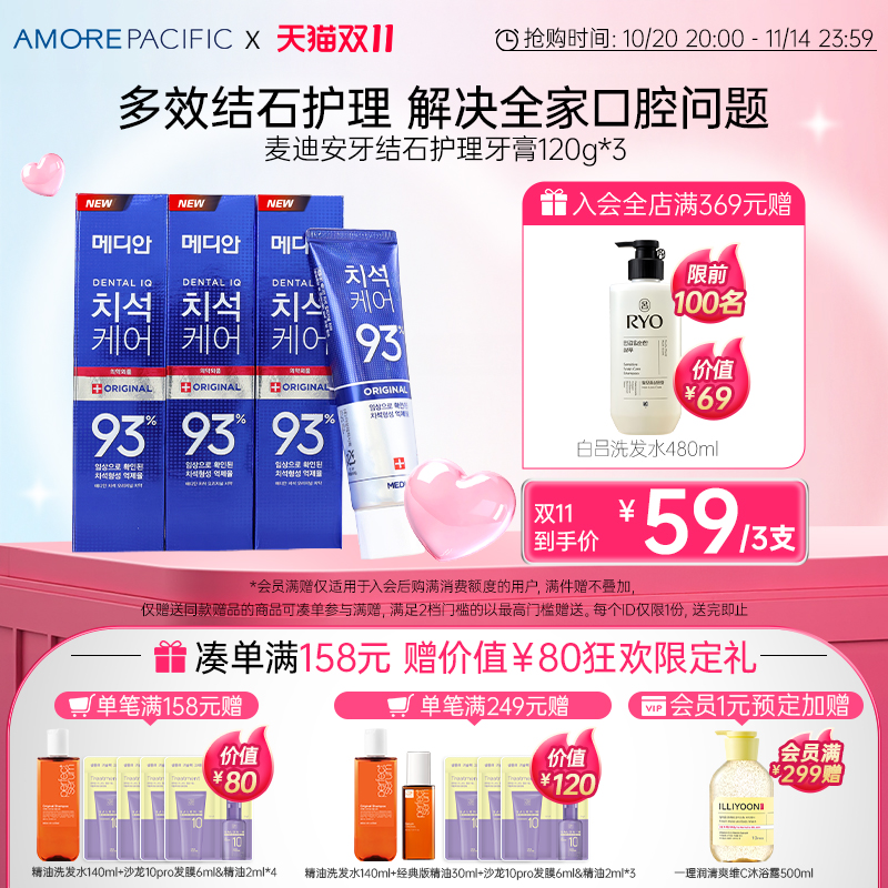 韩国爱茉莉麦迪安93%牙石护理牙膏洁白健齿清新口气去口臭120G*3