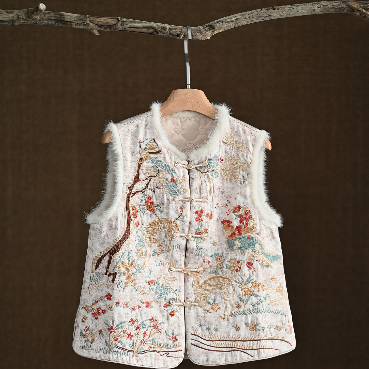 高端日常重工印花新中式毛毛马甲秋冬夹棉对襟盘扣外穿国风背心女