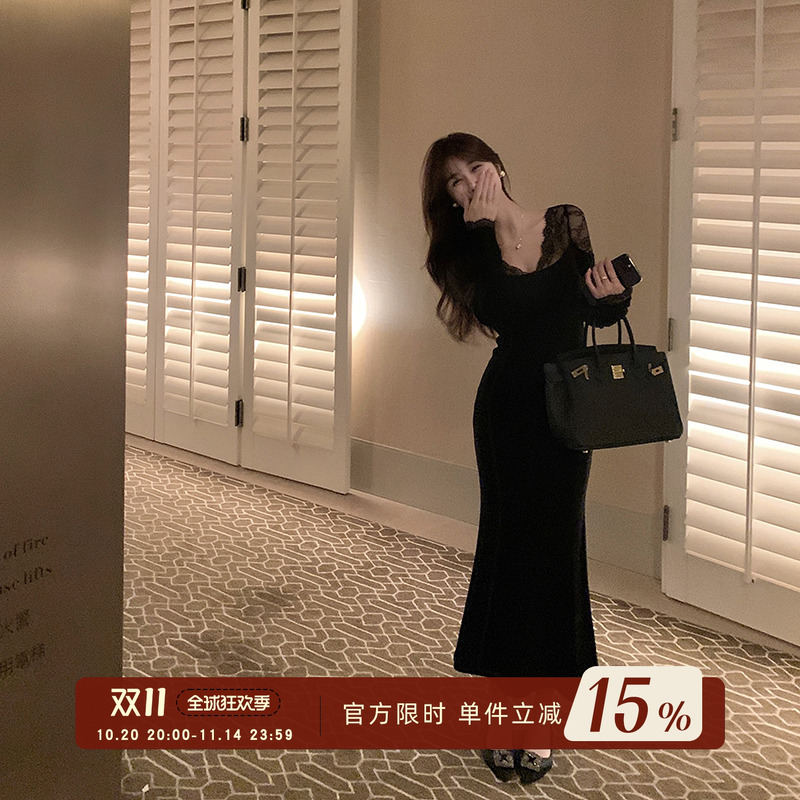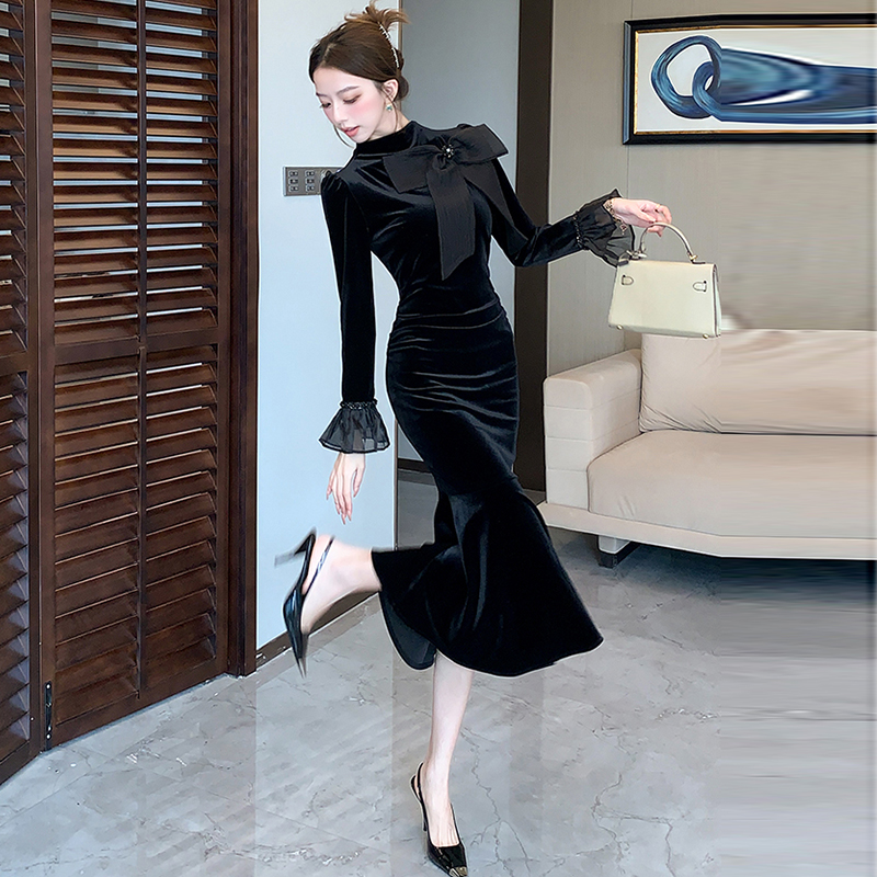 漂亮独特法式内搭长袖气质显瘦收腰丝绒冬季连衣裙女新款鱼尾长裙