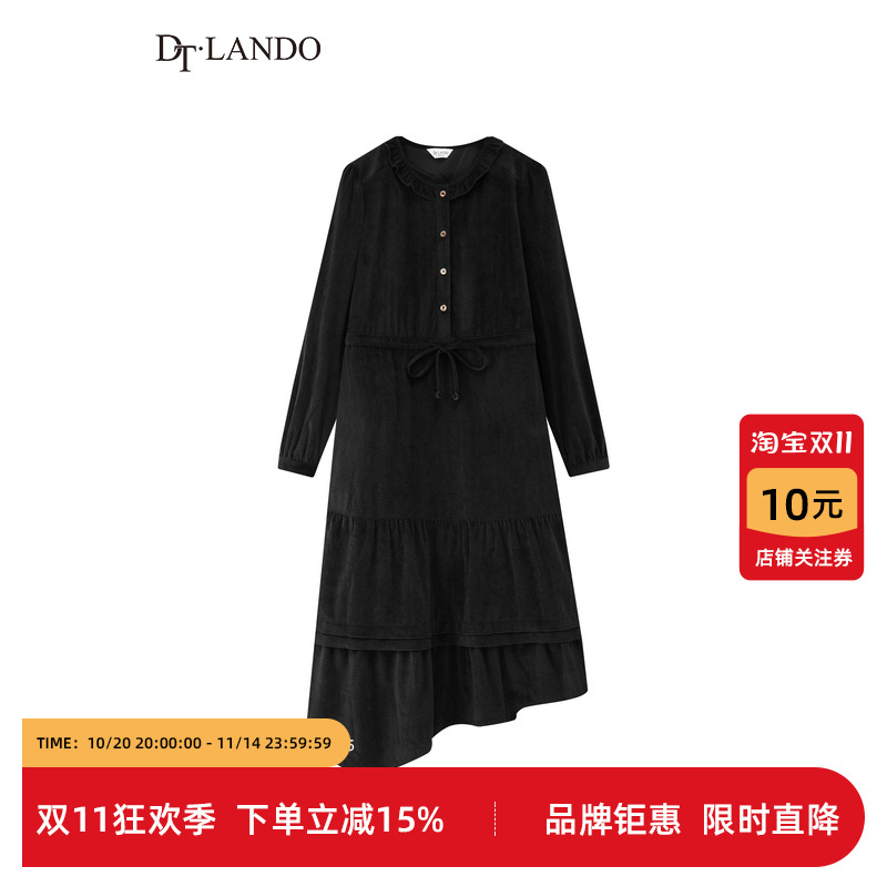DTLANDO冬季连衣裙女优雅范荷叶边圆领收腰不规则下摆A字长裙