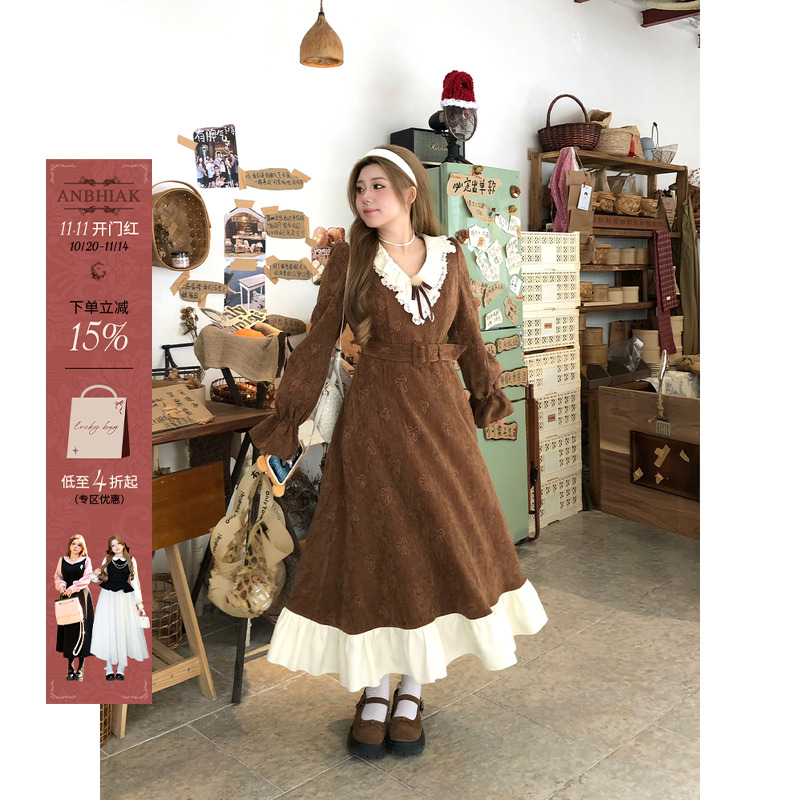 安妮不火复古雪尼尔拼接长裙女2025冬季新款微胖大码设计感连衣裙