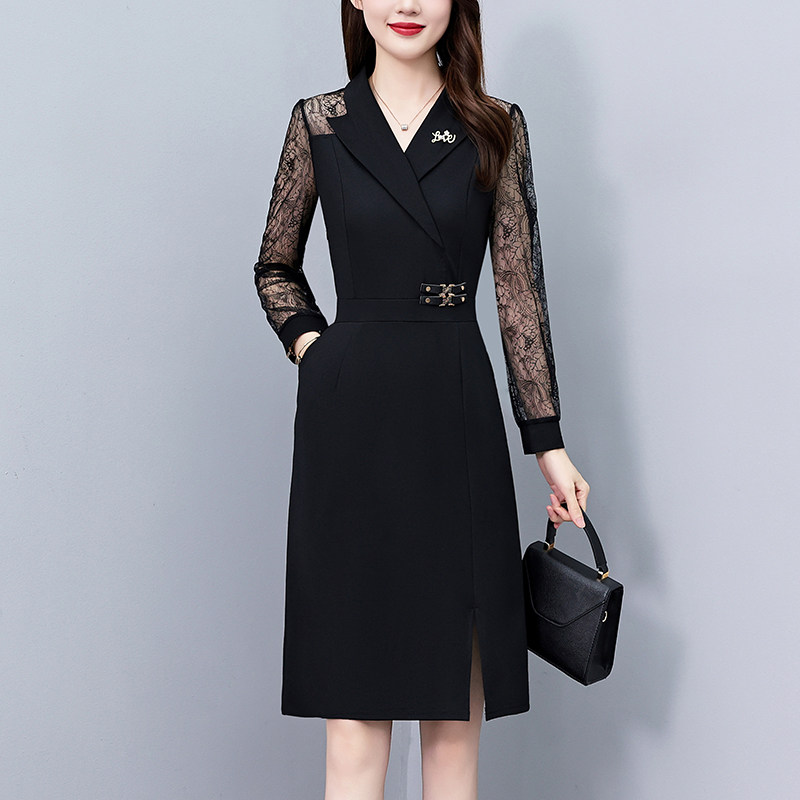 镂空蕾丝长袖气质大码女装胖mm妈妈装秋冬季连衣裙修身显瘦阔太太