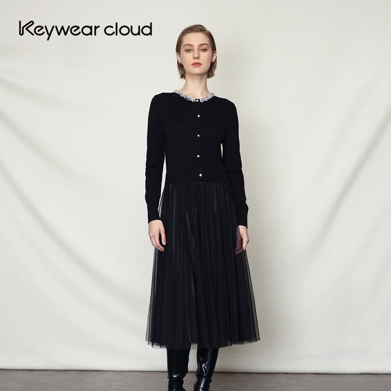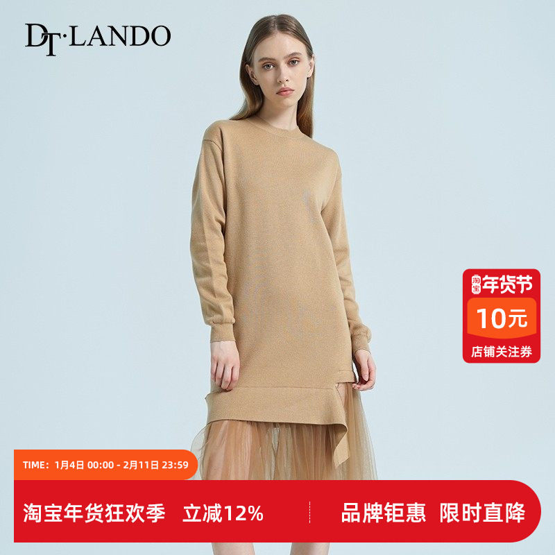 DTLANDO冬季连衣裙时尚新款女装设计百搭假两件针织网纱直筒长裙