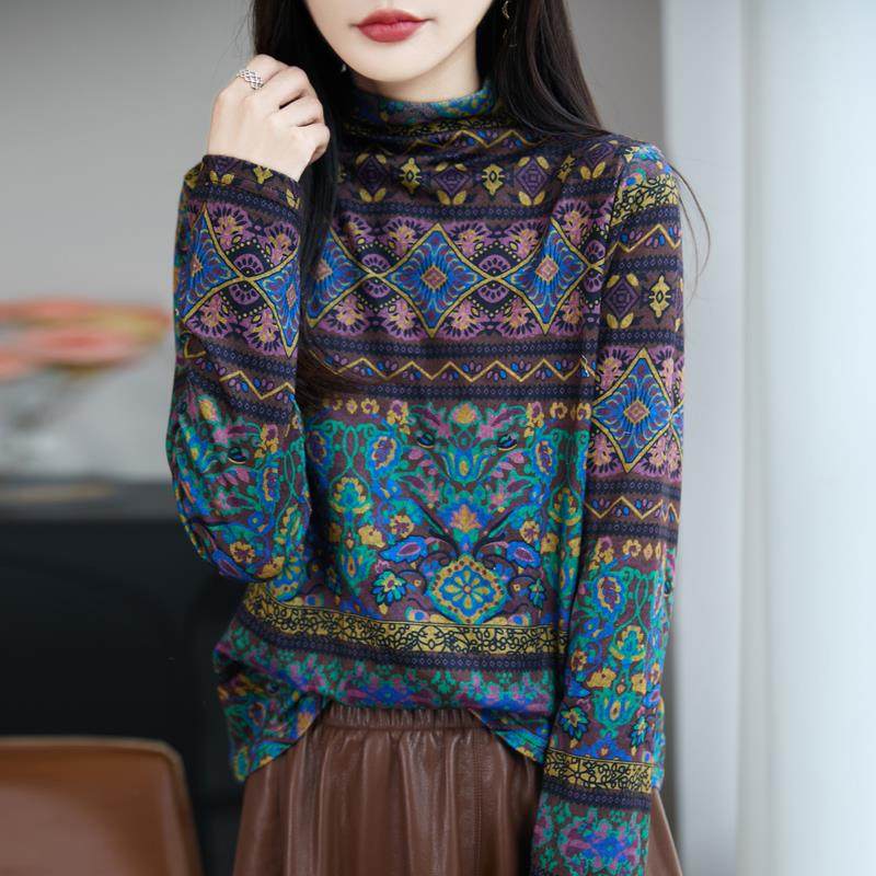 秋季新款半高领羊毛打底衫女内搭别致印花上衣长袖时尚百搭款小衫