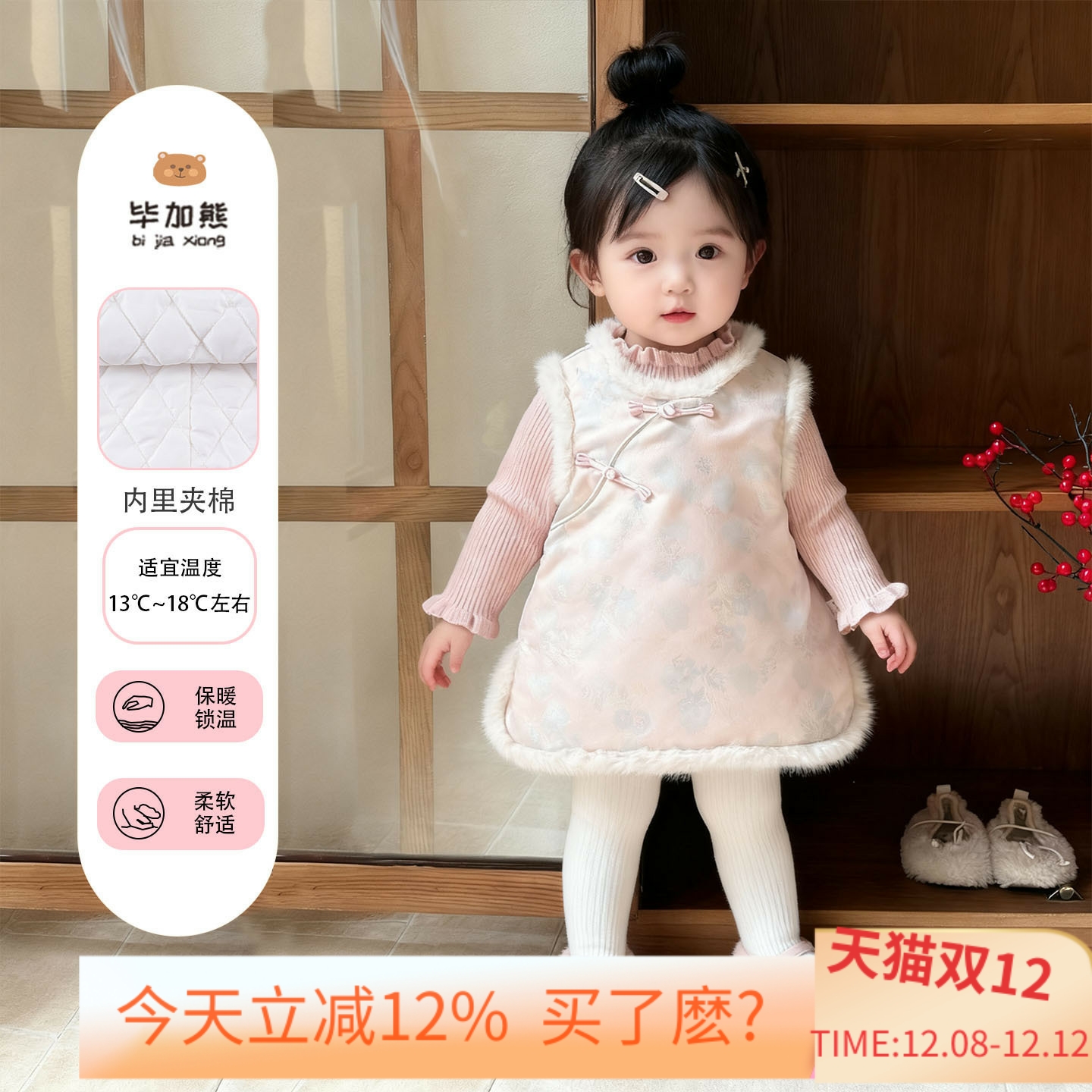 女童唐装旗袍裙子女宝宝周岁礼服套装背心裙国风拜年服过年两件套