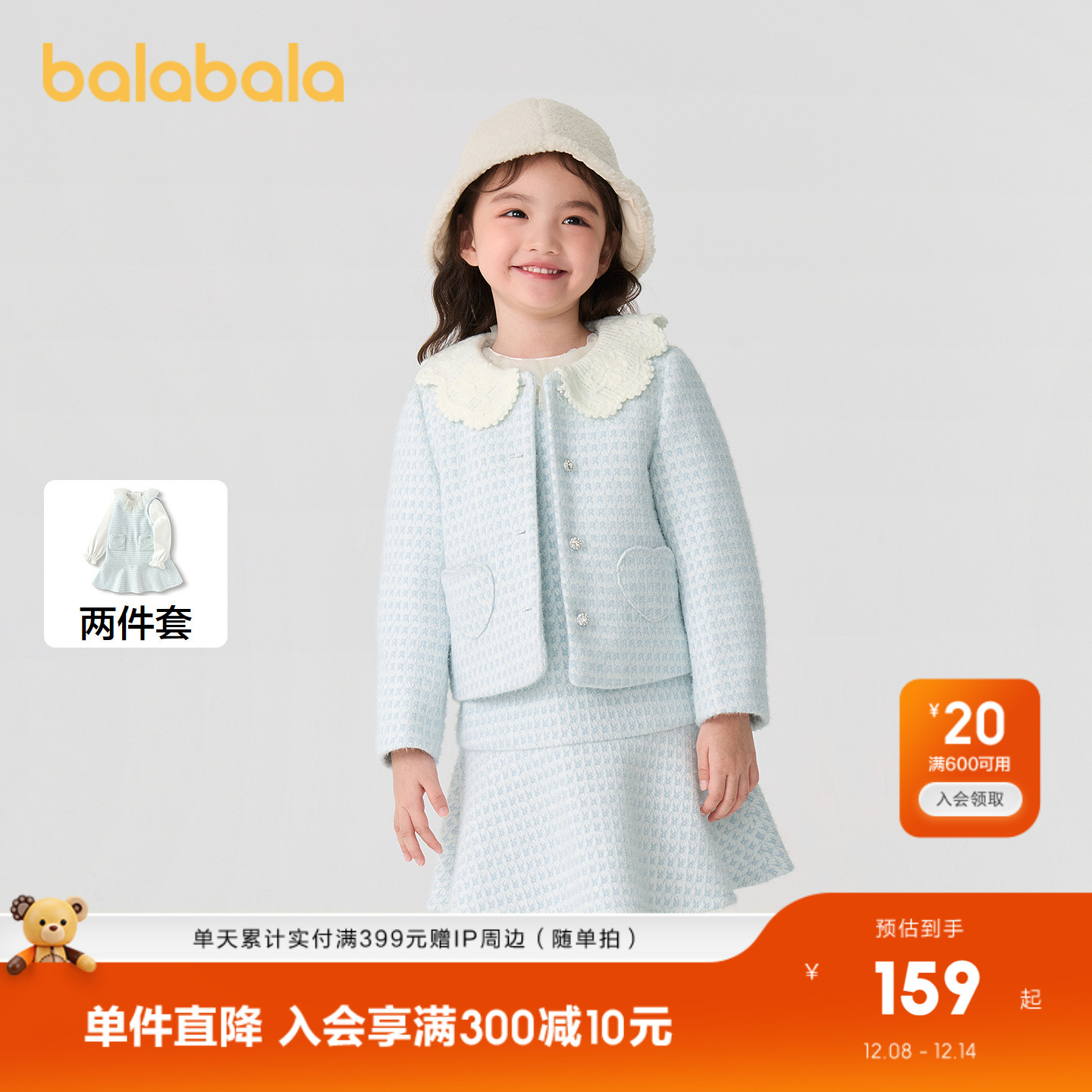 巴拉巴拉女童裙套装千鸟格小香风两件套秋冬装背心裙洋气时尚公主
