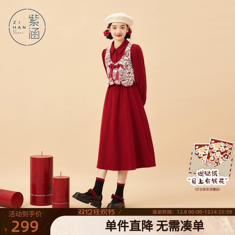阔色新中式红色开衫外套背心裙子两件套装女25秋冬季毛衣连衣裙