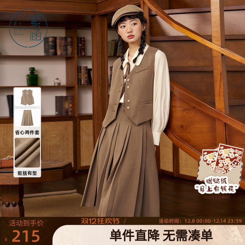 紫涵英伦学院风复古马甲背心中长款百褶裙两件休闲套装女秋季新款
