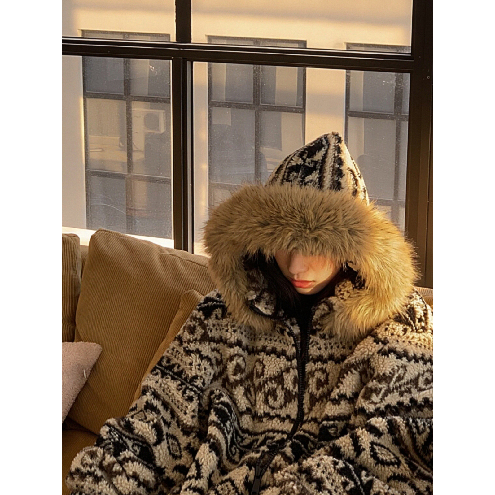 民族风提花羊羔绒外套男女冬季宽松百搭加厚保暖连帽棉服毛领棉衣