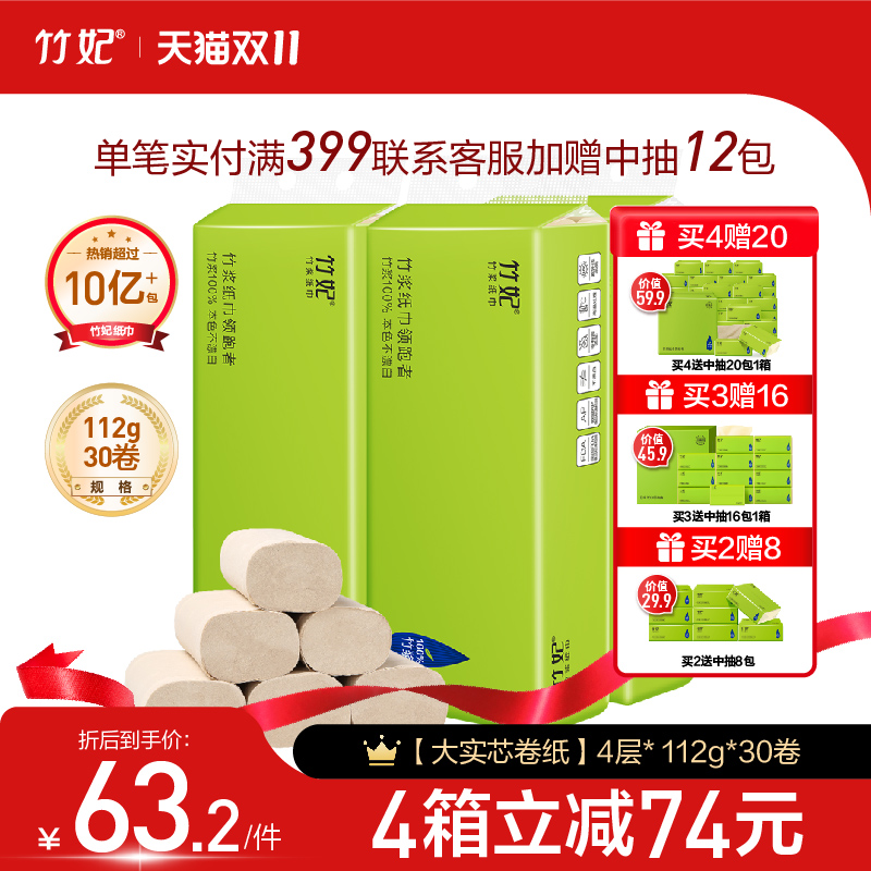 竹妃纸巾卷纸家用实惠装竹浆本色纸卫生纸大卷纸手纸厕纸30卷4层