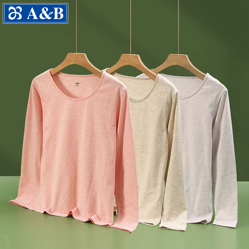 AB内衣女士纯棉秋衣秋冬季保暖衣圆领长袖条纹薄款修身打底棉毛衫
